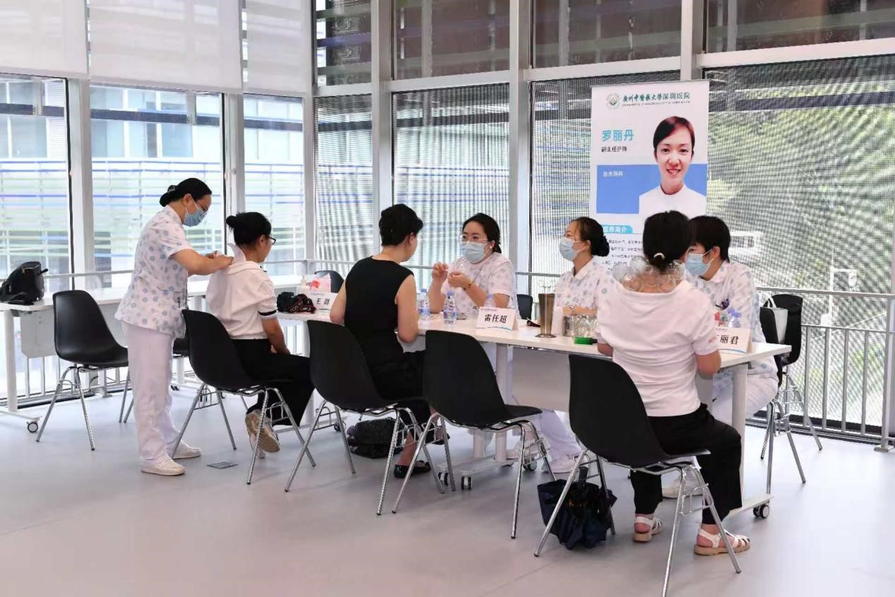 9月10日下午,义诊活动在国际设计学院C栋2101举行。来自广州中医药大学深圳医院内分泌科、皮肤科、妇科、针灸科、耳鼻喉科、治未病科和体检科室的专家们耐心细致地为每一位前来咨询的教师提供了专业、细致的检查和耐心的解答。义诊现场气氛热烈温馨,医生们通过“望闻问切”的传统中医诊疗方式,为教师们辨析体质、解答健康疑惑、提供疾病初步诊断和建议,针对教师职业常见的颈椎病、咽炎、睡眠障碍等健康问题,医生们给出了个性化的调理方案和预防保健指导,还现场演示了简单的穴位按摩保健方法。此外,中医特色理疗区域更是排起了长队,针灸、拔罐、刮痧、耳穴压豆等疗法让教师们亲身体验了中医的独特魅力与即时疗效。